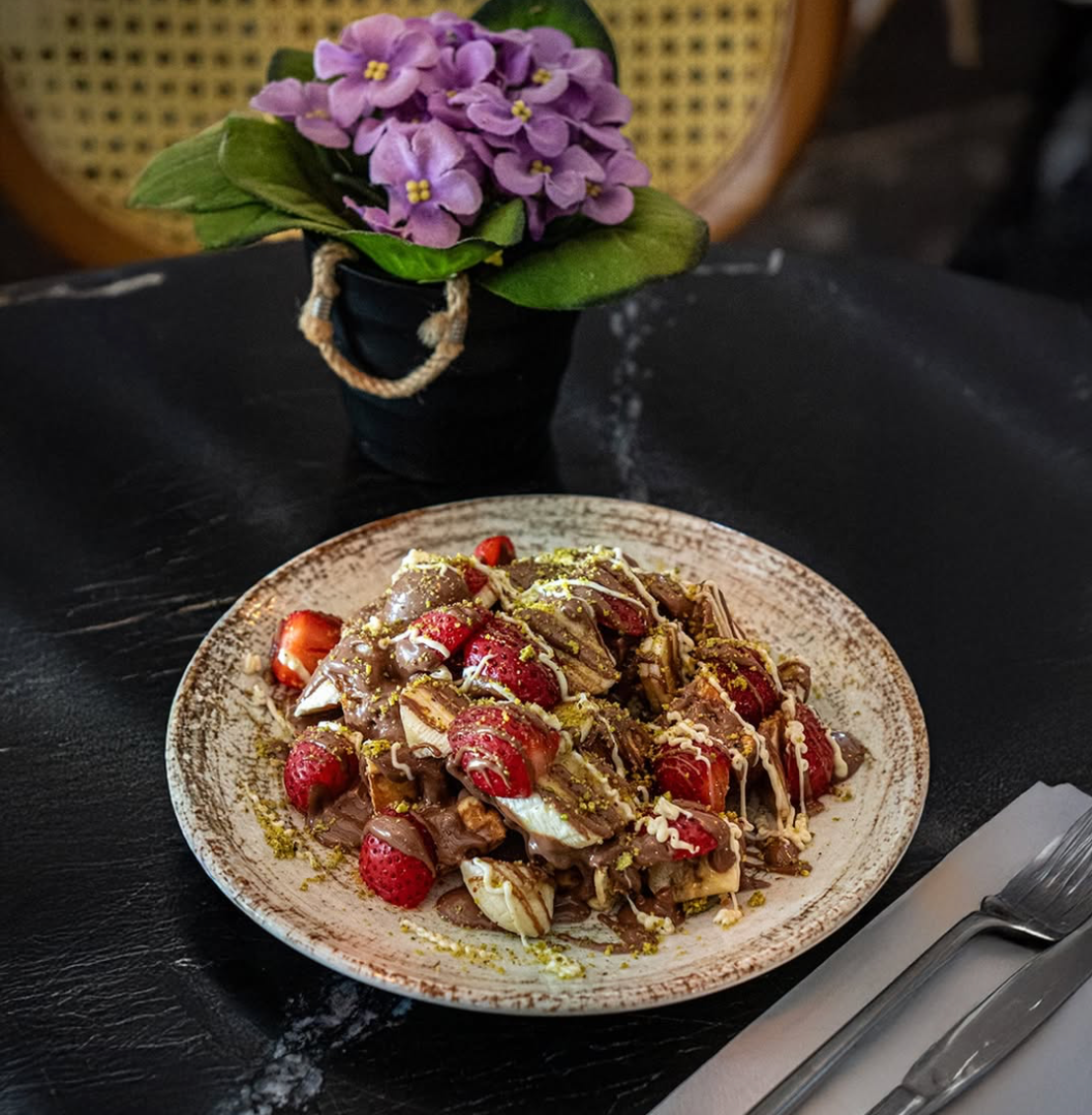 Taze meyve ve çikolata sosla klasik waffle.